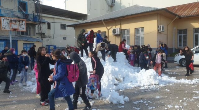 Teneffüse çıkan öğrenciler, kamyonla getirilen karlar ile kar topu oynadı, kardan adam yaparak karın keyfini çıkardı.